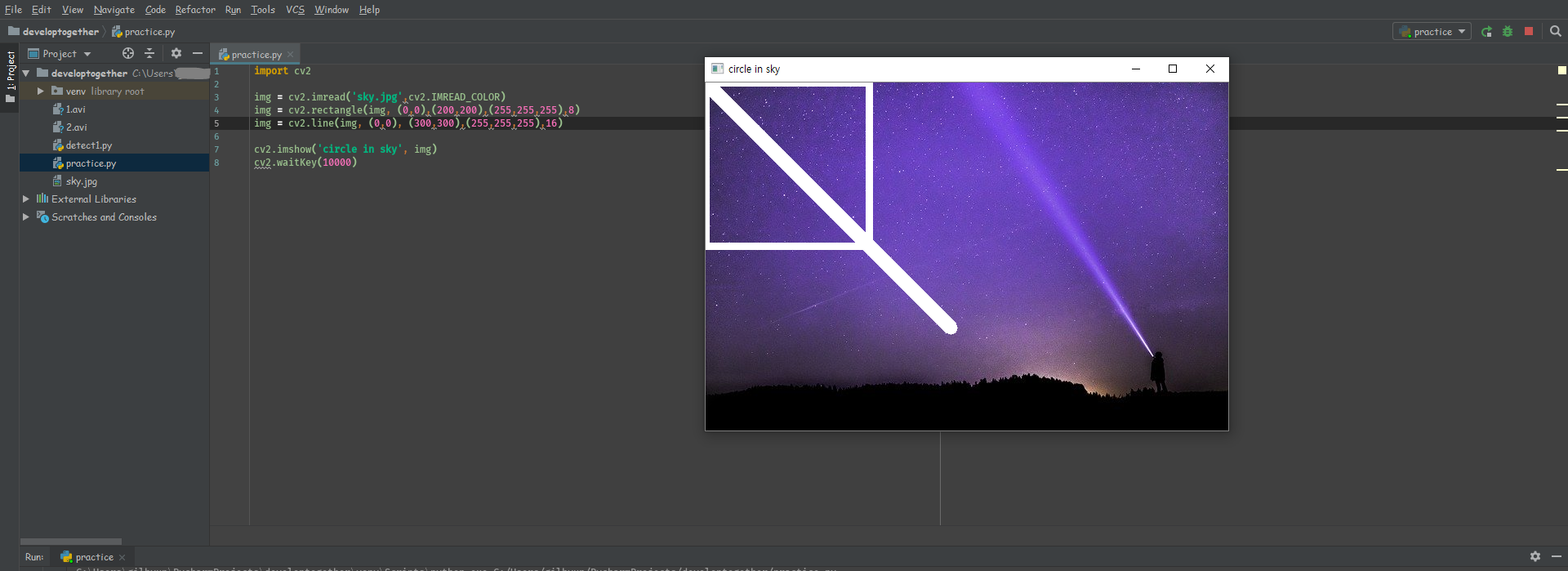 두번째 사진의 사각형과 선을 보면 시작점이 (0, 0)이기 때문에 맨 왼쪽 위에서부터 그려진다. 마지막 thickness argument를 선에 더 높은 값을 주었기 때문에 사각형보다 선이 더 굵게 그려진 것이다.
