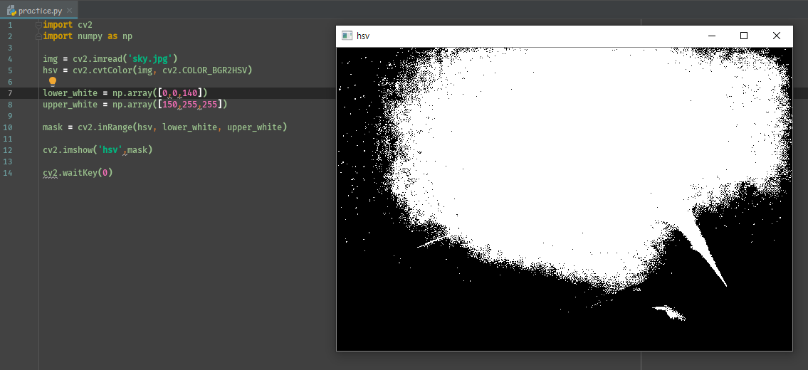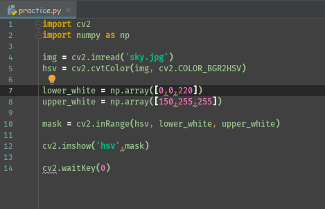 line7, 8에 있는 배열 인덱스들은 [H(0~150), S(0~255), V(220~255)]로 보면 된다.