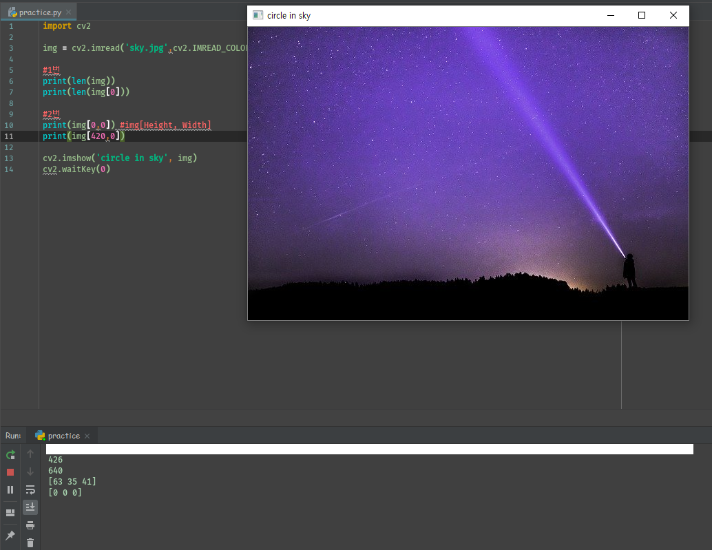2번은 x, y좌표에 따른 BGR의 값을 나타낸다. img[420,0]은 y축으로 420, x축으로 0이라는 뜻이다.