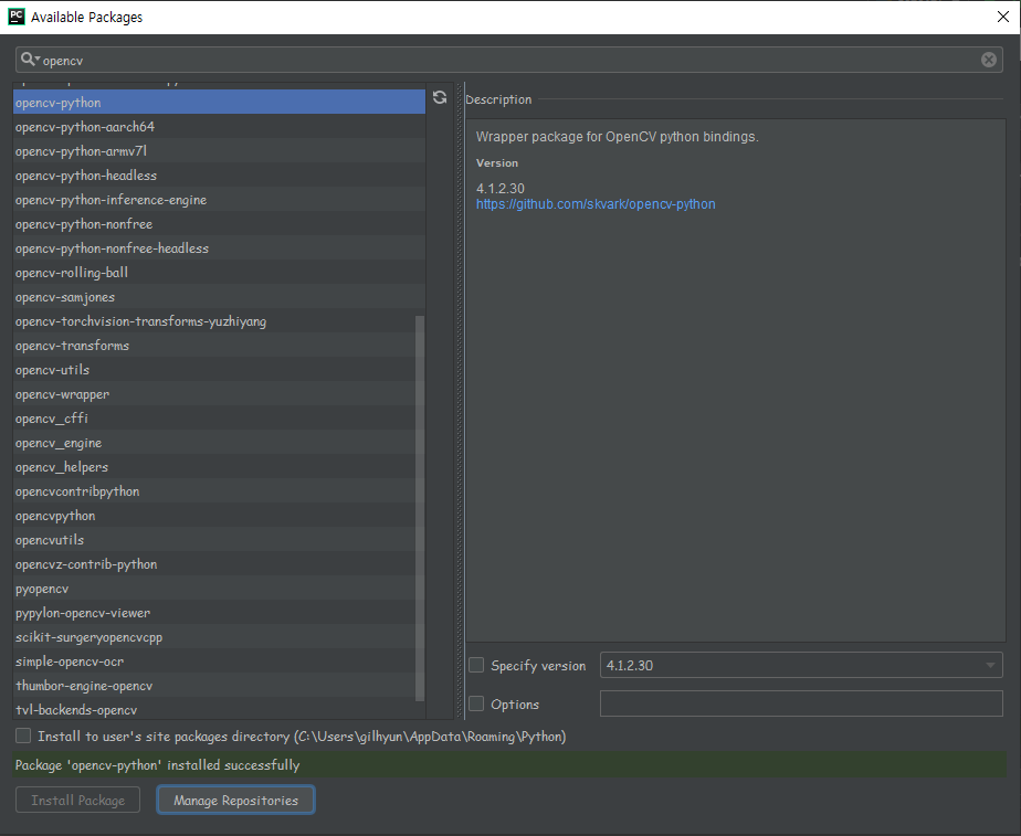 File -> settings -> Project: Downloads -> Project Interpreter -> + (클릭!) -> opencv 검색 -> opencv-python 다운로드